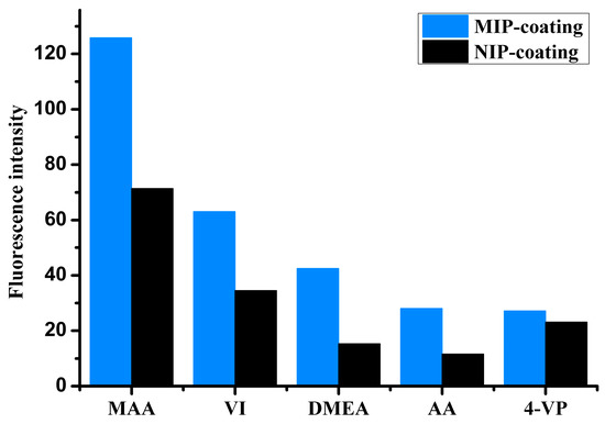 Functional monomer is the key parameter in preparing MIP. In a previous study, we reported the NIP library approach for the screening of the best monomer [30]. The NIP library consisted of 18 cross-linked co-polymers synthesized from monomers commonly used in molecular imprinting. The NIP library, in the form of SPE cartridges, was investigated and successfully applied for water-compatible selective MIP preparation. In this study, a small NIP library was made in the form of polymer-coated chips. The NIP library consisted of five extensively applied monomers, namely MAA, 4-VP, VI, AA, and DMEA, for the preparation of five different MIP- and NIP-coated chips. The procedure described in 2.5 adsorption test was used for the monomer selection. As shown in Figure 2, IBA presented stronger adsorption on the all MIPs than corresponding NIPs. The order of relative strength of IBA adsorption on these MIPs was positively correlated to that of corresponding NIPs. This result is consistent with that reported by C. Baggiani and with the results of our previous studies [30,31]. C. Baggiani et al. reported that there is a clear and positive correlation between the apparent affinity constants measured for the NIP and MIP libraries. Among the polymer coatings studied here, the MAA-based coating was found to exhibit the highest change in relative fluorescence intensity due to IBA adsorption, which indicates that the polymer shared the strongest binding interaction with the target molecule. This was probably because hydrogen bonding is the major type of interaction between IBA and the functional monomers in the polymer, and MAA has the strongest hydrogen bonding interaction with IBA in the monomers tested in this study. As shown in Figure 2, the MAA-based NIP coating exhibited strong binding to IBA. In the MIP coating, IBA and MAA could form a complex in the polymer mixture, resulting in a three-dimensional cross-linked structure via copolymerization. After elution of the template, a predetermined complementary binding site remained in the polymer coating.