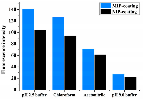 Fluorescence intensities of MIP- and NIP-coated quartz chips in different solutions (5 mg·L−1 IBA solution, λex/em = 294/370 nm).