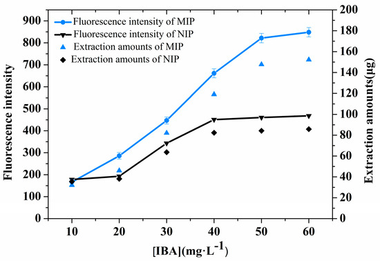 The extraction performances of the MIP- and NIP-coated chips were investigated using IBA solutions of different initial concentrations (10–60 mg·L−1) at pH 2.5. Figure 4 shows that the extraction amount on the MIP and NIP coatings increased with the IBA concentration and that the adsorption amounts of the two coatings were almost saturated at 50 mg·L−1. The extraction capacities of the MIP- and NIP-coated chips were 152.9 µg and 60.8 µg, respectively. Clearly, the extraction amounts of the MIP-coated chips were much higher than those of the NIP-coated chips. This result indicates that the MIP-coated chips exhibit high selectivity and specific adsorption capacity toward the template IBA. The MIP coating exhibited a quantitative response towards IBA (Figure 4) in the buffer, and a quantitative correlation was determined, as described by the equation