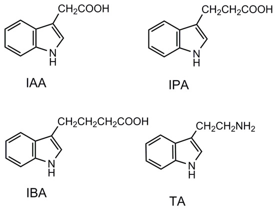 Molecular structures of IBA and its analogues IAA, IPA, and TA.