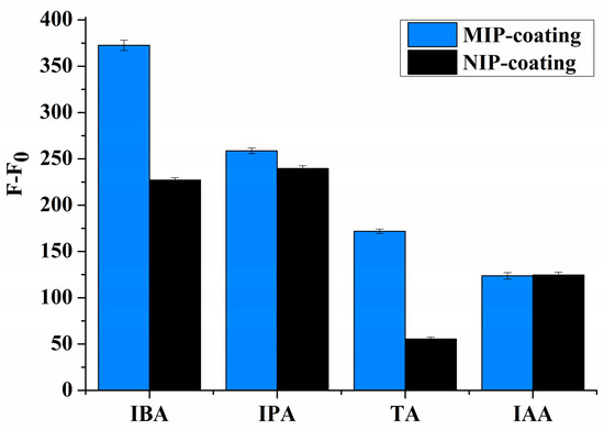Fluorescence intensities of IAA, IPA, and TA adsorbed on the MIP/NIP coating (10 mg·L−1 target solutions in buffer pH = 2.5, λex/em = 294/370 nm).