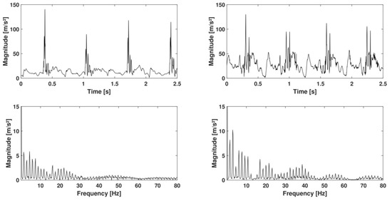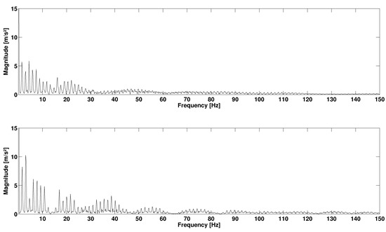 According to Figure 7, the sampling frequency seems unable to encompass a complete running spectrum, but only the 0–50 Hz range. Yet significant information could be located beyond . Sensor H presents a strong spectral coherence, at least for the range 0–100 Hz with contains the most excited range for the running spectrum. It is in contradiction with the studies implementing a second order Butterworth low-pass filter with a cut-off frequency of (e.g., [36]), although peaks are likely to occur beyond this frequency. Even if this sampling frequency ensures proper representation of a complete running spectrum with no significant loss of information, the definition of the bandwidth of the IMUA could be influenced by various factors, including the mass of the device, the Velcro strip tension [37] coupled with the filter effect of human skin [38]. As a matter of fact, the viscoelastic behaviour of human soft tissue has been put forward in several studies to justify the absorption of high frequencies excited by a shock [30,39,40]. Moreover, it is worth noting that the IMUs were tested on shaker and during running with two different types of attachment means. It is recommended that future works should always test both IMUs with a Velcro strip. Finally, the discrepancy between the two sensors can be explained by their different locations on the tibia. For instance, Lucas-Cuevas et al. [41] actually emphasized on the difference in the temporal and spectral parameters depending on the position of the sensors, on the forehead, the proximal section and the section of the tibia.