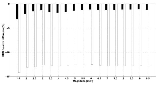 In the first protocol, the measurements for the first step were spread over 24 h: room temperature fluctuated by while hygrometry fluctuated by . The results of this step show that the acceleration in terms of RMS value of H () and H () has a CV of . The results of the second test show the impact of the frequency on the sensor response (Figure 5). The figure displays the evolution of the relative difference in RMS between the IMUAs and their references as a function of frequency. It is observed that sensor H underestimates acceleration. Relative error does not exceed below but keeps increasing up to beyond . Similarly, the H sensor also underestimates the value of acceleration. However, the error increases from and exceeds for frequencies over . Beyond , relative error stabilizes around . The results of the last step on the impact of the magnitude on the sensor response are presented in Figure 6, where evolution of the relative difference in RMS between the IMUAs and references are plotted against the amplitude. Sensor H seems to underestimate the amplitude of the measured signal. However, error remains stable around on the range 1.5–9.5 m/pers. The H sensor displays a similar behavior, but error is stable around on the tested range.