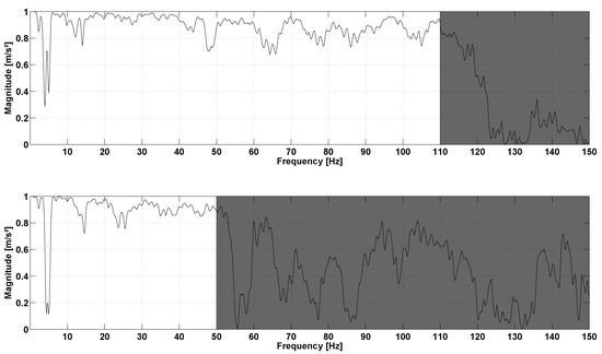 In the second protocol, the results of the repeatability step are also expressed in terms of RMS value: (CV = ) for H, (CV = ) for H, (CV = ) for R, (CV = ) for R. The total acceleration spectra of R for two different speeds are presented in Figure 7. This figure shows that the running speed directly impacts the frequency signals. Higher peaks of amplitude are observed at high-speed running. Moreover, higher speeds tend to excite higher frequencies. At , the relevant frequencies lie within the range 0–120 Hz, but exceed at . However, range 0–100 Hz generally represents the most important part of the spectrum with a larger amount of energy for cumulative frequencies. The coherence curves exhibit three types of frequency ranges (Figure 8). The first frequency range represents the stride frequency (fundamental) and two or three harmonics (black area). The second type of frequency ranges are those encompassing lesser energy (white area). These frequency ranges are characterized by lightly excited ranges (with low magnitude) and low spectral coherence. The third type of frequency ranges are those with a strong coherence (grey area). Remarkably, the most relevant ranges of frequencies display the strongest coherence and clearly represent the IMUA response to the signal frequencies.