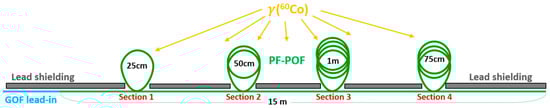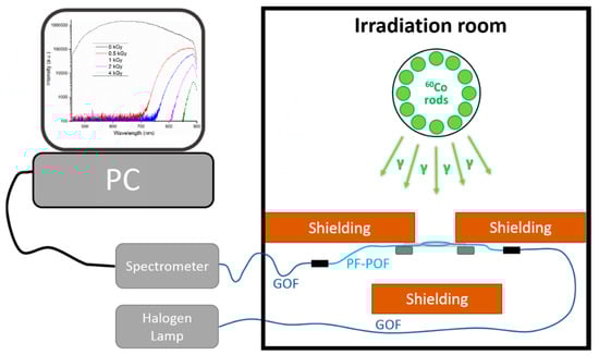 A fiber-coupled halogen lamp AQ4305 from Yokogawa Electric Corporation (Tokyo, Japan) was used as a source of broadband light, while a computer-controlled CCD spectrometer HR4000 from Ocean Optics (Dunedin, FL, USA) was used to monitor fiber transmission during irradiation. The spectrometer is sensitive in 450–900 nm wavelength range. For each sample, integration time was optimized to yield the maximal initial intensity level that does not saturate the spectrometer. A boxcar smoothing function of the spectrometer was used and set to 10 point smoothing. The transmission spectrum of the sample was saved every 5 s, 1 min, and 5 min for irradiation at 150 Gy/h, 15 Gy/h, and 1.5 Gy/h, respectively. Auxiliary MM glass optical fibers were used to connect the PF-POF sample placed in the irradiation room with the optoelectronics located in the control room. The rest of the PF-POF, connectors, and connecting GOFs were shielded from the radiation by lead bricks. Only 1 m of the PF-POF sample was irradiated during each individual irradiation session.