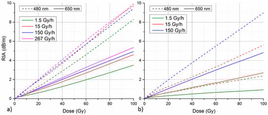 Section 3.1). Both fibers exhibited similar spectral character of RIA in the monitored wavelength region and close to linear RIA growth with increasing dose level. While PF-POFs drawn from preform typically provide slightly better optical performance (e.g., lower attenuation, smoother backscattering traces), they appear to suffer from much stronger dose-rate dependence than co-extruded PF-POFs. Obtaining the same dose reading regardless of irradiation conditions is a key requirement for quantitative dosimetry applications. Therefore, the tested PF-POF drawn from preform (Fontex, Asahi Glass Company) that exhibited strong dose-rate dependence could be deemed as rather unsuitable for radiation monitoring applications. In this context, the co-extruded PF-POF (GigaPOF-50SR, Chromis Fiberoptics) exhibited considerably better performance. Dose-rate dependence could still be observed to a smaller extent; however, the results indicate that the magnitude of the effect decreases with the growing dose rate and decreasing wavelength. Moreover, the fiber has rather high radiation sensitivity making it interesting for low dose applications.