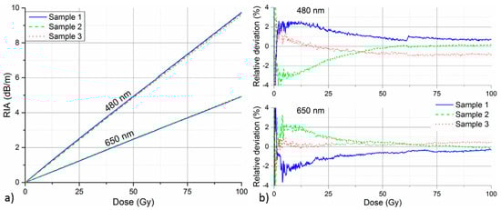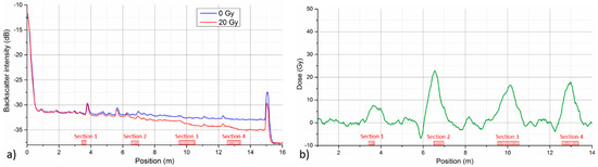 Figure 7). For longer irradiated sections (0.5, 0.75, and 1 m), we have been even able to reconstruct the actual dose value with a fair accuracy. However, practical potential of presented approach for true distributed dosimetry measurement is limited due to more pronounced dose rate and temperature dependence, as well as relatively fast post-irradiation annealing of RIA at 650 nm. Further optimization of the distributed system with respect to operational wavelength is rather problematic. Operation at wavelengths on the blue side of the VIS spectrum could bring higher sensitivity and better dosimetric performance, but at a price of significant shortening of monitoring length, yielding the system rather impractical. On the other side, using longer wavelengths with lower inherent attenuation, one might monitor longer fiber lengths, but fiber’s RIA sensitivity at these wavelengths is considerably diminished [
