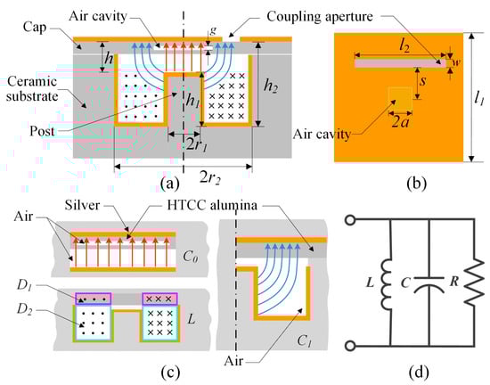 According to [], the equivalent capacitance C of the re-entrant resonator includes two parts, C0 and C1, where, C0 is the parallel capacitance between the post top and the central cap, i.e., the red section in Figure 1a, and C1 is the capacitance between post side wall and the end cap, i.e., the blue section in Figure 1a. This is in good agreement with the simulation result which was obtained using the ANSYS HFSS software (ANSYS, Inc., Canonsburg, PA, USA). The capacitance C0 shown in Figure 1c, can be represented by two parallel-plate capacitors in series containing different dielectric media i.e., alumina and air. We can calculate C0 as