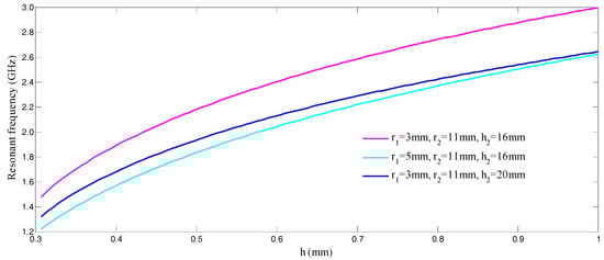 Since there are totally 11 variables for determination of the sensor dimension as showed in Expressions (3)–(7), MATLAB software is used via initialization of variables to qualitatively study the variation of the sensor resonant frequency as a function of increasing pressure. Figure 2 illustrates the change in resonant frequency of three different cavity configurations with a variation of h. Here, we use h to characterize the amount of loaded pressure. For the sensor designed by us, the re-entrant resonator cap depicted in Figure 1a, with a sealed cavity is viewed as the pressure sensitive part. When the gas pressure loaded on the sensor increases, the top and bottom films of the cap deform inwards, towards the sealed HTCC cavity. It can be seen from Figure 2 that with the decrease of the gap h, the theoretical resonant frequency f0 of the re-entrant resonator decreases and the sensitivity of the sensor increases. A comparison of three cavity configurations demonstrates that the smaller the inner radius r1 and height h2, the higher the sensitivity of the sensor. For the dimension designed for this sensor, according to [,], the Q factor of the re-entrant resonator will increase with an increase in the gap h, thus causing an increase in the sensing distance. Besides, a larger dimension of the sensor will lead to a smaller resonant frequency, resulting in reduced propagation path loss, leading to increase in the sensing distance. Taking into consideration both the sensitivity and sensing distance of the sensor, a tradeoff should be made between its sensitivity Δf0/Δh and Q factor. Thus, the dimension (r1 = 3 mm, r2 = 11 mm, h = 0.7 mm, h2 = 16 mm) which has been preliminarily chosen for our design denotes a cavity resonant frequency of 2.58 GHz.