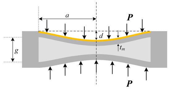 For the sensor proposed in this work, the pressure-sensitive cap is a rectangular mechanical model as shown in Figure 3, where tm is the thickness of the deformed plate and d is the maximum central deflection. Since the four edges of the plate are clamped and the length of each side meets the condition d << tm according to [] (where a donates half of the length of the plate side), the model can be characterized with the small deflection bending theory of thin plate (tm << 2a). The maximum central deflection of a single plate can be expressed as [,]