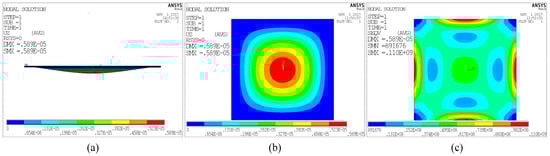 where E is the Young’s modulus and v is the Poisson’s ratio of the deformed material. It can be concluded from the ANSYS simulation results that when a single plate is uniformly loaded with 120 kPa barometric pressure, the maximum central deflection is 5.89 μm as shown in Figure 4a,b, and the maximum stress is 110 MPa which is distributed along the four edges, as represented by the red section in Figure 4c. Since the maximum stress is lower than the bending strength of 320 MPa, plastic deformation and rupture are not caused.