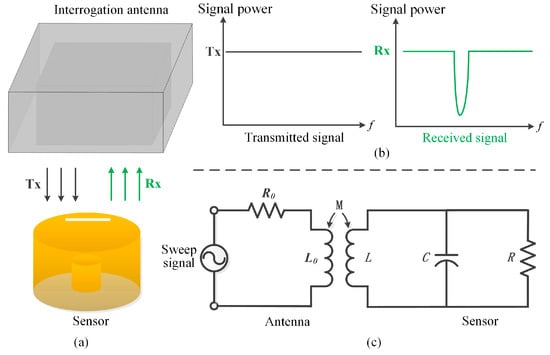 To realize wireless signal transmission between the sensor and the readout device, a standard waveguide antenna is used, which acts as a virtual waveguide-coaxial transformer that can transmit a series of sweep interrogation signals, containing the sensor resonant frequency. To interrogate the sensor, a slot was cut off on the cap, allowing the linearly polarized electromagnetic wave transmitted from the interrogation antenna to couple with the re-entrant resonator, namely, the metal-coated cap where a slot acts as a response antenna. This has been represented in Figure 5a. Because of the presence of an open slot, the re-entrant resonator resonant frequency and the electromagnetic field distribution display a small variation in comparison with the resonator that is entirely metal-enclosed. We can verify this by comparing the results of the HFSS simulation with the sensor model constructed under eigenmode and waveguide drive mode, respectively. However, for the resonator model equipped with a slot, this is not a major concern and it can still work properly in accordance with the field distribution and resonant frequency of the enclosed resonator. For the received electromagnetic wave having multiple frequency components, only the specific wave whose electromagnetic field component is in agreement with the re-entrant resonator dominant mode, could generate continuous oscillations of standing-wave inside the resonator. The waves corresponding to other frequency components are reflected from the slot antenna and return to the interrogation antenna. This demonstrates the signal transmission process of the backscattering pressure sensor as shown in Figure 5b. By extracting the value of return loss (S11) of the interrogation antenna via a vector network analyzer (VNA), the resonant frequency of the re-entrant resonator can be obtained, which is accompanied by a negative peak. Figure 5c represents the equivalent lumped circuit model corresponding to the signal coupling between the interrogation antenna and the sensor. Since we know its working principle, the coupling phenomenon is clearly visible to us. L0 and R0 are the equivalent inductance and resistance of the interrogation antenna and M is the mutual inductance between the interrogation antenna and the sensor.