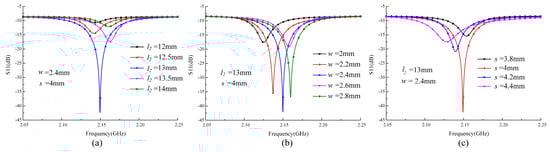 When pressure is loaded on the plates of the sensor cap, the resonant frequency of the re-entrant resonator changes due to the reduction of the gap h. Hence, the measurement of pressure can be realized by evaluating the relationship between resonant frequency and pressure. The wireless passive signal readout method will cause severe attenuation of the signal energy, mainly due to the path-loss. Hence, here we focus on the impedance matching between the re-entrant resonator and slot antenna because good impedance matching leads to higher sensor resolution and longer distances over which wireless sensing may be conducted. To enhance the signal coupling between the slot antenna and the re-entrant resonator, Ansoft HFSS software is used to design and optimize the dimensions and positions of the slot by utilizing the model illustrated in Figure 1. Since impedance matching is related to the return loss (S11), we can obtain the optimized dimensions of the slot antenna by comparing the values of S11 obtained from the simulated curve. The HFSS simulation results of a slot antenna having a width w, length l2, and location dimension s are shown in Figure 6. With the incorporation of several variables, a good matching is obtained along with a relatively small return loss.