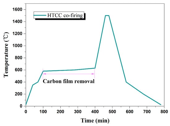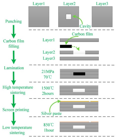 Owing to the rapid development of micro-machining and HTCC technologies, the proposed pressure sensor with optimized dimensions can be fabricated with ease and precision. The sensor substrate is fabricated with alumina ceramic by adding an internal post to form a cylinder and the structure of an inner torus channel. Next, the ceramic surface is polished to satisfy the requirements of roughness and dimension. The sensor cap with a sealed air-cavity is fabricated using the HTCC technology []. The ESL 44000 (ESL ElectroScience, King of Prussia, PA, USA) green tape was used as the HTCC material and its properties are listed in Table 2. The main fabrication process is roughly composed of drilling, carbon film filling, lamination, high-temperature sintering (sintering curve is plotted in Figure 7), screen-printing, and low temperature sintering. These steps have been illustrated in Figure 8. First, a cavity hole was drilled, which was subsequently filled with carbon film to support the pressure-sensitive plates and prevent them from collapsing and cracking during the lamination process. Afterwards, the laminated sensor cap was sintered in a muffle furnace.