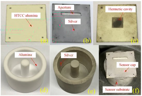 It should be noted that the green tapes before sintering are porous with various little holes. This could be known from the ESL44000 data sheet. The ESL44000 is a flexible cast film of 96% alumina powder dispersed in an organic matrix. This material gets denser during sintering from 25 °C to 1500 °C to yield a hard and white-colored alumina ceramic that is not porous. During sintering, the carbon film in the cavity reacts with the air which enters via the little holes and eventually turns into CO2 exhausting via the holes. An air-sealed cavity is formed at the end of the sintering process. And the pressure inside the cavity is estimated to be one bar, owing to the final equilibration between the inner and external pressure. After high temperature sintering of the sensor cap, the slot antenna patterns were printed on its surface by the screen-printing technique, for which Dupont 6142D silver (Dupont, Wilmington, NC, USA) paste was used. Next, it was placed inside a muffle furnace at 125 °C for 15 min to dry the silver paste followed by sintering at a peak temperature of 850 °C for 1 h. Finally, the silver-coated substrate and the sensor cap were aligned, assembled, and fixed by evenly coating a layer of high temperature resistant glue between the contact surface of sensor cap and substrate. The cap is glued on the substrate but not hermetically because we didn’t coat the glue for the whole contact surface between the cap and the substrate, while just coat for several contact points. The as-fabricated silver-coated sensor cap and sensor substrate are shown in Figure 9a–e respectively; the assembled sensor is shown in Figure 9f. It should be noted that to eliminate the influence of skin effect, the thickness of the printed metal should be ten-fold of the skin depth []. For silver, the skin depth can be calculated to be 1.26 μm corresponding to a frequency of 2.58 GHz. Hence, the thickness of the coated silver should be at least 12.6 μm.