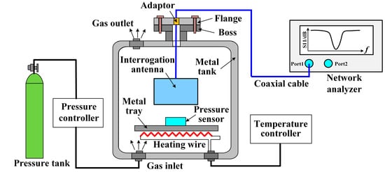Moreover, the pressure sensor proposed in this work has the advantages of no additional sealing and packing requirements for gas pressure measurement. However, the measurement being conducted inside a hermetical metal chamber poses great challenges. Thereby, we propose two methods to solve the problem of difficulty in signal detection in a metallic environment and realize pressure measurement from 40 to 120 kPa, corresponding to a temperature range between 24 °C and 800 °C.