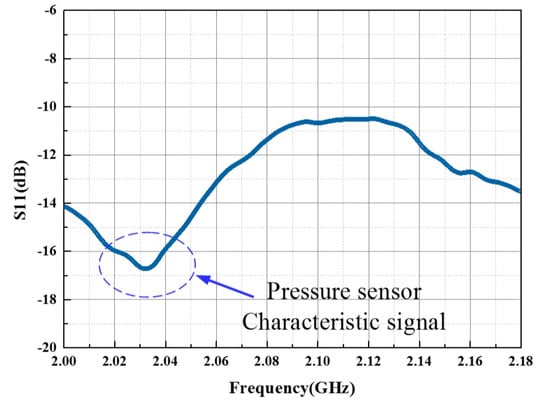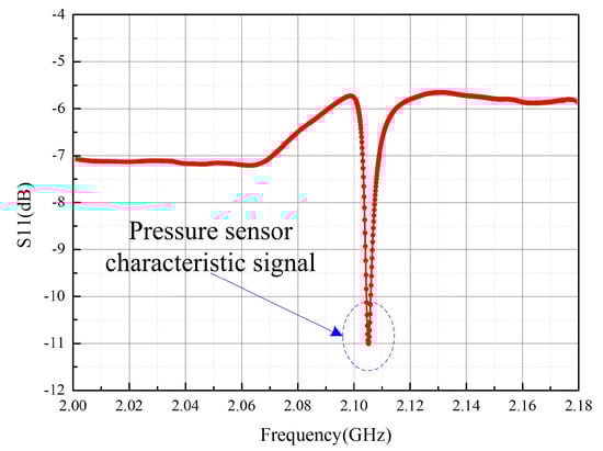 While operating, the sensor could work at the resonant frequency of 2.1065 GHz in an open environment which has a deviation from the calculated resonant frequency of 2.58 GHz. The possible reasons could be the existence of modeling errors in the calculation of equivalent values of L and C and the assumption of alumina being a non-magnetic material. It was found in Figure 11 that the readout signal with a relatively gentle negative peak of the unloaded sensor may be overlooked during detection. If we load gas pressure on the sensor at higher temperatures, it is possible to lose the characteristic frequency.