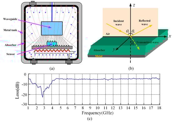 (a) Schematic of the measured pressure sensor in the metal sealed chamber; (b) Operating mechanism of electromagnetic wave absorber with incident angle θi, reflected angle θr, and transmitted angle θt; (c) RATG-2 GHz-3 mm absorber performance curve.