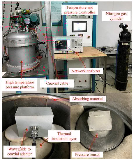 The developed high-temperature pressure measurement platform equipped with an electromagnetic wave absorbing material is shown in Figure 13. Since the limit of temperature tolerance of the electromagnetic wave absorbing material is 250 °C and the temperature resistance of the coaxial cable is low, a thermal insulation layer was utilized. Consequently, the response curve, shown in Figure 14, becomes more distinguishable, which verifies the feasibility of the aforementioned electromagnetic shielding method.
