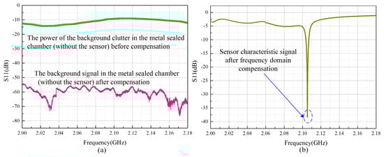 To raise the signal to noise ratio (SNR) of the readout signal further, background compensation method is utilized in the frequency domain, as shown in Figure 15a. The upper curve represents the signal of the background clutter inside the metal-sealed chamber at a certain moment (in the absence of the sensor) before including the compensation step, while the lower curve represents the background signal taking into account the compensation in the frequency domain. The entire signal processing is achieved in the absence of the sensor via a VNA. Initially, the background clutter data is stored inside the memorizer of the network analyzer, following which the real-time background clutter data is used to subtract the afore-stored data in the frequency domain. From Figure 15a, a significant reduction in the average value of the background clutter, i.e., from −10 to −60 dB was observed, indicating that the frequency-domain background clutter compensation method could effectively improve the SNR of the sensor signal. Figure 15b depicts the measured sensor signal after the inclusion of compensation. It is observed that, in comparison with the curve shown in Figure 14, the one in Figure 15b is smoother and the characteristic signal of the sensor can be distinctly recognized.