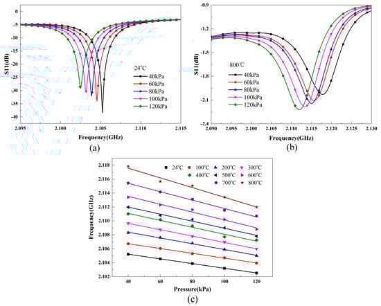 Next, for performing measurement, the pressure sensor was heated by the heating wire placed under the metal tray. The heating temperature was in the range of 24 °C to 800 °C, which could be incremented at a rate of 10 °C/min with a stabilization time of 20 min between each 100 °C mark. When the temperature value stabilized at separate points of 24 °C, 100 °C, 200 °C, 300 °C, 400 °C, 500 °C, 600 °C, 700 °C, and 800 °C, nitrogen was released into the metal-sealed chamber within a pressure range of 40 kPa and 120 kPa at an incremental step of 20 kPa. Figure 16a illustrates a group of pressure response curves of the sensor corresponding to 24 °C, where, with the increase of pressure, the characteristic frequency was found to drift towards lower frequency. The pressure response curves recorded at 800 °C, shown in Figure 16b, presented a similar tendency of frequency variation, but the signal strength was obviously attenuated. The attenuation could be due to the increased dielectric loss (for the increase of the loss tangent) of the alumina ceramic and metallic loss (for the increase of equivalent resistance) of the silver layer under the high temperature environment, thus resulting in a sharp fall of the Q factor.