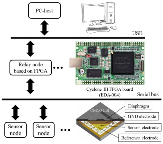 As shown in Figure 1, in our previous research [], we have proposed a tactile sensor network system, including three network layers: sensor node, relay node and host layers. By using the integration and packaging technologies of a Micro-Electro-Mechanical-Systems (MEMS) capacitive sensor and a Complementary Metal-Oxide-Semiconductor (CMOS) Large-Scale Integration (LSI) circuit chip, we fabricated the sensor node, which has already been completed and evaluated at device and system levels [,]. Since the MEMS sensor is locally connected to a sensor readout circuit, this sensor system has high sensitivity, high noise tolerance and high speed response. For the capacitive sensor readout circuit, a capacitance-to-frequency converter and a frequency counter are embedded in the CMOS-LSI of the sensor node. Therefore, the capacitance information can be encoded into data packets as digital count values. The Field-Programmable Gate Array (FPGA) based relay node receives data packets from sensor nodes through a shared serial bus. After decoding, the relay node transmits these data packets to the PC-based host for analyzing through a Universal Serial Bus (USB) communication.
