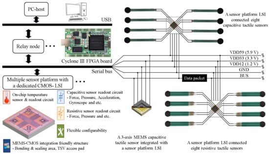 Sensor platform LSIs are mounted on a flexible cable that includes five lines, three power lines (VDD12, VDD33, VDD59), one signal line (BUS) and one ground line (GND). Stretchable and bendable cables can be used for covering curved and movable robot surfaces []. The cable is connected to an FPGA-based relay node. The relay node receives data packets from the sensor platform LSIs for some primary data processing such as data decoding and error check with Cyclic Redundancy Check (CRC) codes, and then transmits CRC passed data packets to the PC-based host. The relay node also receives configuration command packets from the host, and after encoding, transmits these command packets to a specific or all sensor platform LSIs. Because each sensor platform LSI has an 8-bit physical address for specific configuration, a relay node can handle 255 sensor platform LSIs at the maximum, and the address with all bits being 1 is used for broadcast. A USB interface (FT2232HL chip from Future Technology Devices International Ltd., Glasgow, UK) is used for communication between the relay node and the host. We assume up to 127 USB connections of the relay node for one host. As a result, more than 30,000 sensor platform LSIs in this system can be installed.