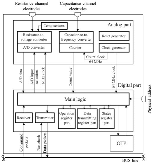 The sensor platform LSI was fabricated by a TSMC (Taiwan Semiconductor Manufacturing Co., Ltd., Hsinchu, Taiwan) 0.13 standard CMOS process technology. As shown in Figure 3, the analog part includes a clock generator, a reset generator, capacitance-to-frequency converter and resistance-to-voltage converter circuits and a temperature sensor. The on-chip clock is generated by a ring oscillator circuit, and its typical frequency is 64 at design stage (about 60 at measurement stage).