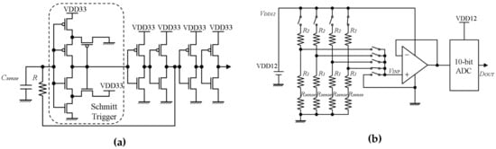 Diagrams of analog-to-digital converter circuits: (a) capacitance-to-frequency converter circuit; (b) resistance-to-voltage converter circuit.