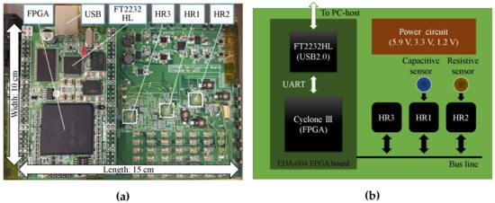 As shown in Figure 5, we fabricated a Printed Circuit Board (PCB) to evaluate the sensor platform LSI. On this evaluation board, three sensor platform LSIs (HR1, HR2 and HR3) have been implemented and connected to a relay node through the same bus line. The relay node is based on a USB-FPGA board (EDA-004, HuMANDATA Ltd., Osaka, Japan). For the evaluation, we first used several capacitors and resistors with different nominal values to evaluate the performance of the capacitance-to-frequency converter and resistance-to-voltage converter in comparison with our design. Then, we used this system to evaluate the performance of commercially available capacitive sensors from Oga Inc. (Toyama, Japan) and resistive sensors from Interlink Electronics Inc. (Westlake Village, CA, USA).