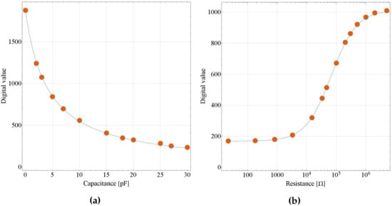 In Equation (4), after configuration, sampling time [] can be regarded as a constant. We can obtain the value of by curve fitting to points of nominal capacitance values of capacitors and their corresponding count value . Wolfram Mathematica (Wolfram Research, Inc., Champaign, IL, USA) and the Levenberg–Marquardt algorithm were used for curve fitting, and Figure 6a shows the fitting result. The digital value of each point represents the average of more than 1000 measurement values. R-squared is 0.99987, which means the fitting explains 99.987% of the total variation in the data, which is about the average. The difference between the fitting and the design values of is 4.89% of the design value.