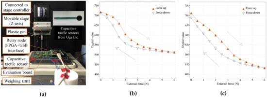 Figure 7b,c shows external forces and decoded sensor output relationships of the capacitive sensor. The digital value of each point was the average of more than 1000 measurement values. Hysteresis loops of external forces from 0 to 6 were confirmed []. In the case of Figure 7c, a 2 thick, around 6 diameter Polydimethylsiloxane (PDMS) cover was put on the sensor for confirming one kind of usage situation. As shown in Figure 7b, an inflection point appears. We think the reason is that the relationship between the external forces and the average displacement between two plates of the capacitive sensor becomes nonlinear, with the relatively bigger sensor (Diameter: 8 ) being pushed by a small pin (Diameter: 3 ). This can be verified by Figure 7c. The PDMS cover distributes the external force and results in a more linear force and average displacement relationship, which leads to a more linear relationship between external forces and decoded sensor outputs. However, using the PDMS cover, the hysteresis becomes larger.