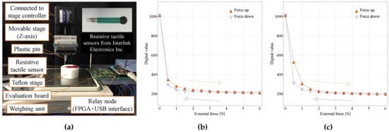 Figure 8b,c shows relationships between external forces and decoded sensor outputs of the resistive sensor. The digital value of each point was the average of more than 1000 measurement values. Hysteresis loops of external forces from 0 to 6 were confirmed []. In the case of Figure 8c, a 2 thick, around 6 diameter PDMS cover was put on the sensor. The adding of the PDMS cover resulted in a more moderate resistance change along with force change. However, the same as the capacitive sensor case, using the PDMS cover leads to a larger hysteresis.