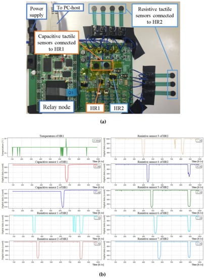 After evaluating the sensor platform LSI, we demonstrated our multi-sensor system. Figure 9 shows the demonstration setup and the display of the C# software on the PC-host with the previously used evaluation board. In this demonstration, two sensor platform LSIs, one relay node and one host were used. One of two sensor platform LSIs (HR1) was configured for capacitive sensing mode, and connected two capacitive sensors. The other sensor platform LSI (HR2) was configured for resistive sensing mode, and connected seven resistive sensors. These two sensor platform LSIs were connected to the relay node through the same bus. The C# software was used to display real-time sensing data of these nine tactile sensors as well as one temperature sensor from HR1. Digital values of each sensor output were updated every 0.1 . As shown in Figure 9b, temperature sensing data by using the on-chip temperature sensor, tactile sensing data by using off-chip capacitive and resistive sensors were acquired simultaneously.