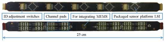 As shown in Figure 10, five sensor platform LSIs are implemented in one cable. Sensor platform LSIs and ID switches are mounted on one side of the cable. On the other side of the cable, resistive and capacitive channel pads are mounted. These pads are used to connect z-axis resistive or capacitive tactile sensors by soldering. The middle sensor platform LSI is prepared for integrating with a MEMS capacitive sensor, so there is no soldering pad connected to it. A connector was used to connect the ends of cables.