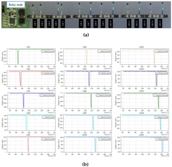 Simultaneous operation demonstration of 15 sensor platform LSIs configured for capacitive or resistive sensing mode: (a) demonstration setup, Nos. 1, 2, 5, 6, 9, 11, 14 sensor platform LSIs connect one capacitive tactile sensor each and Nos. 4, 7, 10, 12, 15 sensor platform LSIs connect one resistive tactile sensor each; (b) display of real-time multiple sensing data acquisition in C# software.