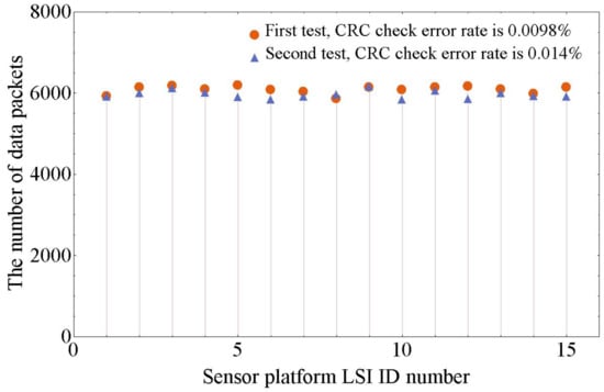 Figure 12 shows the data receiving results at the PC-host side of two tests. In each test, three FPC cables were connected in series to a relay node. All of the 15 sensor platform LSIs were configured for capacitive sensing mode and operating simultaneously. The data sending rate of each sensor platform LSI was set to 1 , and the data receiving time at PC-host was 40 s in each test. To relieve data congestion, the adaption function [] was turned on by configuration. As shown in Figure 12, the CRC check error rates are 0.0098% and 0.014%. These CRC check error data packets come from the data collision on the bus. The maximum difference of the number of data packets received from different sensor platform LSIs in these two tests are 5.6% and 5.4%, respectively. All of the 120 capacitive channels are sampled at a frequency of about 146 . These results have proved that the multi-sensor system can acquire numerous sensing data with low data loss and similar data transmission frequency from every sensor platform LSI on the shared bus.