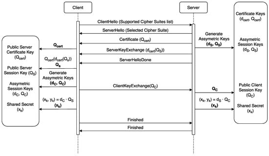 Figure 2 illustrates the messages exchanged during the handshake when using the cipher suite with a ECDHE key-exchange algorithm. refers to private keys, while public keys are the ones defined as . The procedure takes place as follows: