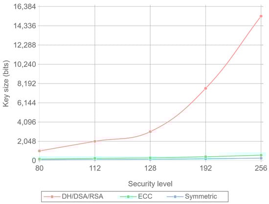 The process of finding the required prime numbers is fairly simple and the operations required are not computationally expensive. The problem with the RSA system is that existing algorithms such as Quadratic Sieve [71] or General Number Field Sieve [72] allow for a faster integer factorization than brute force or prime guessing approximations. The problem is even worse, due to the fact that these algorithms work much better the larger the number they are trying to factorize. As a consequence, the security level that RSA can provide does not grow lineally with key size. This behavior can be observed in Figure 3, where RSA, ECC, and symmetric ciphers are compared. The key size needed for the different security levels presented is described in Table 2 [73]. The actual values shown in Figure 3 are taken from TLS curve implementations [62] in the range of these key size values. It can be observed that even for low security levels, RSA key sizes are much larger than ECC key sizes.