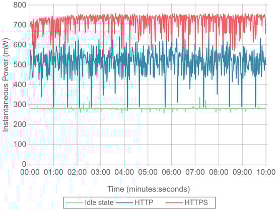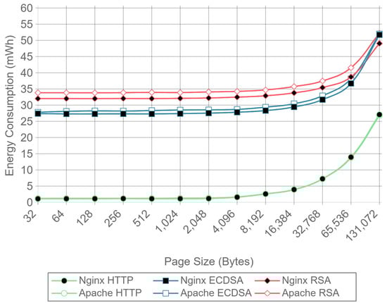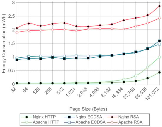 ECC and RSA power consumption has been also studied in different scenarios [24,82,83]. Moreover, a framework for analyzing power consumption of cryptographic algorithms and security protocols is proposed in [84]. In such a paper, the authors examine several cryptographic algorithms from the three main classes (i.e., asymmetric, symmetric, and hash) jointly with a comprehensive analysis of the energy requirements of the security mechanisms. They also study the power consumption requirements of the transport-layer security protocol (Secure Socket Layer (SSL)) considering the impact of various parameters at the protocol level (such as cipher suites, authentication mechanisms, and transaction sizes) and the cryptographic algorithm level (i.e., cipher modes, strength). The researchers carried out the evaluation on a Compaq iPAQ H3670 Pocket PC, which contains an Intel SA-1110 with a Strong ARM processor clocked at 206 MHz, 64 MB of RAM, and 16 MB of Flash ROM. The paper presents the power consumption of the different steps involved in the algorithms analyzed (e.g., key generation, key exchange, signing, verifying). They also tested the SSL protocol to transmit payloads that range from 1 KB to 1 MB. After the analysis, the authors presented five conclusions. First, asymmetric and hash algorithms have the highest and least energy costs, respectively. Second, the energy cost of asymmetric algorithms is dependent on key size, while symmetric algorithms are not significantly affected. Third, the power consumption of a symmetric algorithm depends not only on the bulk data encryption and decryption cost, but also on the key set-up cost. Fourth, wide variations in power consumption exist within the same family of cryptographic algorithms, and finally, a trade-off between the level of security provided by the algorithm and energy savings can be achieved by tuning the parameters.