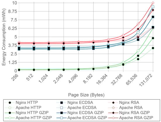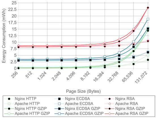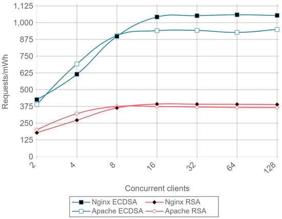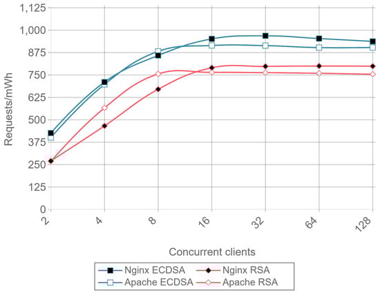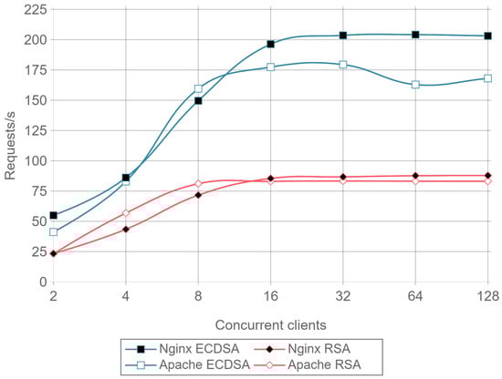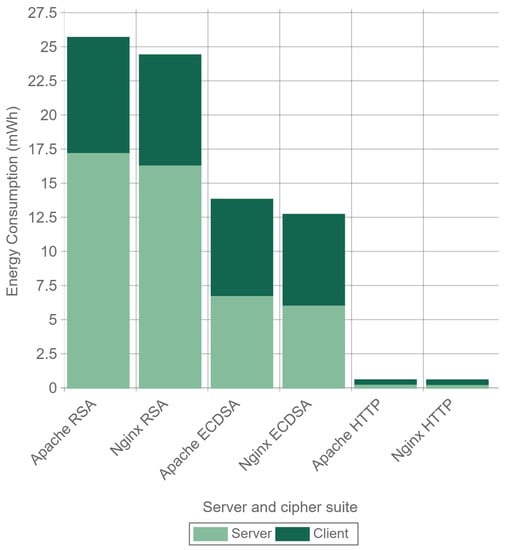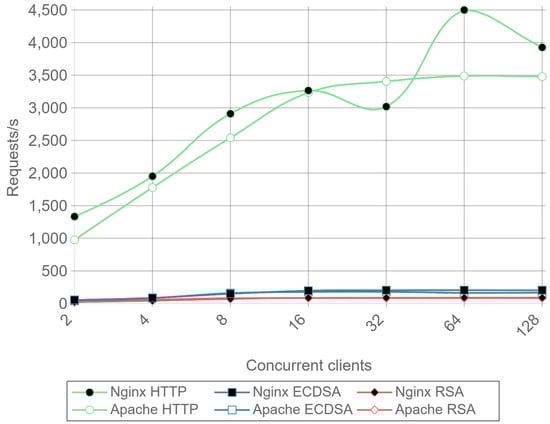 As explained in Section 2.4, ECDHE can be used as the key-exchange algorithm to obtain PFS. Note that DHE can also be used, but it is clearly outperformed by ECDHE [64]. The only reason to use DHE instead of ECDHE is the existence of possible incompatibility issues, but nearly every TLS implementation supports both algorithms [65,66,67,68]. ECDHE-RSA cipher suites signs the ServerKeyExchange message using the RSA public key certificate. In addition, certificates can be generated with different public key sizes, 2048-bit RSA being the minimum size considered secure nowadays. In addition, 768-bit RSA was factored in 2010 using the number field sieve factoring method [69] and a 1024-bit RSA implementation of OpenSSL was successfully broken using a fault-based security attack in less than 100 h [70]. However, note that the use of a 2048-bit certificate on an ephemeral key-exchange algorithm introduces heavy overhead and computing requirements, which are very difficult to accommodate on the constrained hardware capabilities of most IoT devices. The encryption and decryption processes take place every time a device accesses or sends data over a secure connection. Although expensive public-key operations are needed only in the beginning of the communications (i.e., during the TLS Handshake), they are renegotiated when a new session is established. Moreover, IoT gateways, that need to manage a great number of connections are even more affected by this encryption overhead, reducing throughput, and increasing power consumption.