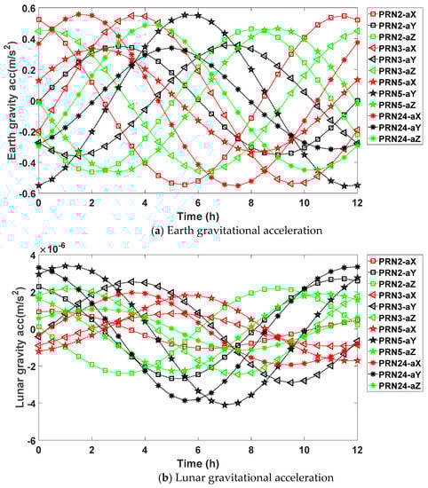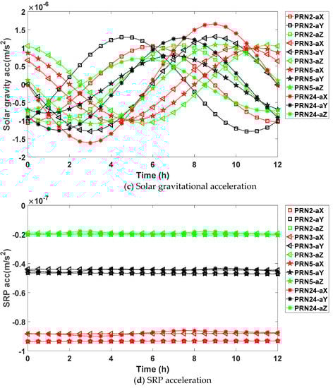 As we can see from the following Figure 2, the magnitudes of the accelerations are consistent with those in Table 2. The Earth’s gravitational acceleration varies between 0 to 0.6 m/s2, and the values for different satellite are similar. For the lunar gravitational acceleration, the absolute value peaks round 4 × 10−6 m/s2, and varies with the motion of the GPS satellite. The maximum absolute solar gravitational acceleration is around 2 × 10−6 m/s2, which is the same magnitude as the lunar gravitational acceleration. For the SRP acceleration, the magnitude is between 1 × 10−8 m/s2 and 1 × 10−7 m/s2; meanwhile, the SRP plot for PRN 2 and PRN 5 overlaps due to the small difference of SRP acceleration leveled at 1 × 10−11 m/s2.