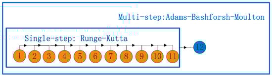 Various numerical methods have been developed to solve the above equation, such as Euler’s, the Modified Euler, Midpoint, Runge–Kutta [13], and Adams–Bashforth–Moulton methods [14]. In this experiment, the Runge–Kutta and Adams–Bashforth–Moulton methods are applied. Firstly, the single step Runge–Kutta method is applied to get the start points; then, the Adams–Bashforth–Moulton multi-step method is used to predict forwards. The general expression of the Runge–Kutta method can be expressed as the following Equation (6):
