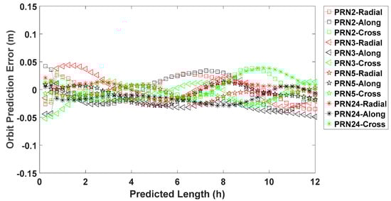 Orbit prediction error in the radial, along-track and cross-track directions over 12 h on DOY 109 of 2017 for GPS satellite PRN 2, PRN 3, PRN 5 and PRN 24.