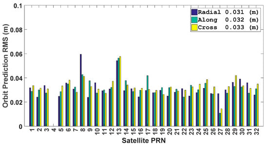 Afterwards, the GPS satellite orbit prediction is carried out from DOY 106 to 112 of 2017. For each day, the satellite orbit is predicted for 12 h, and then the average RMSE values for the whole week are calculated. The average RMSE of the orbit prediction is shown in following Figure 5. As we can see, the average RMSE values in all three directions are smaller than 0.060 m for all GPS satellites, and the average RMSE in three directions are close to each other. Meanwhile, the average RMSE values of the 31 satellites are 0.031, 0.032, and 0.033 m for the radial, along-track and cross-track directions.