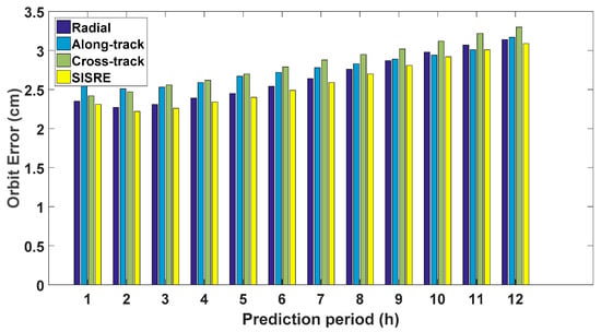 where weight factors is the statistical constribution of radial (R), is the statistical constribution of along-track (A) and cross-track (C) errors to the line-of-sight ranging error. For GPS, and are 0.98 and 1/49, respectively [16]. The average RMSE of all satellites and SISRE over different periods, namely from 1 h to 12 h, are plotted in the following Figure 6.