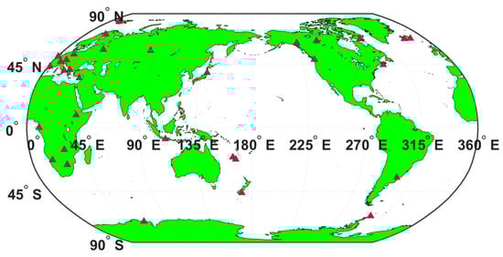 For the static PPP, the GPS observation data from 32 globally distributed stations are downloaded through ftp on DOY 108 of 2017, which is shown in Figure 7.