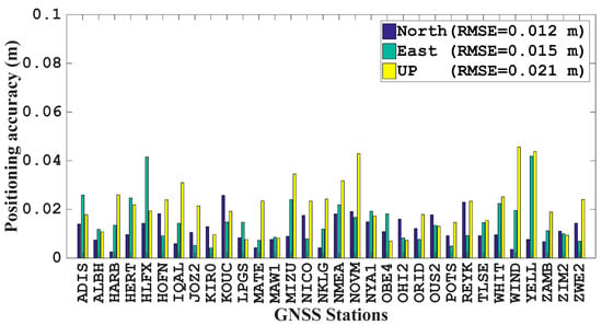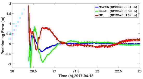 The reference coordinates for all of the IGS stations are obtained from the Scripps Orbit and Permanent Array Center [17]. Then, the static PPP accuracy is shown in Figure 8. As we can see from Figure 8, the RMSE values for all of the selected stations are less than 5 cm in all three directions. The various positioning accuracy is due to the different visibility of satellites as well as the geometry. For stations like MAW1 station, the positioning RMSE values are around 1 cm for all three directions, while the vertical positioning RMSE of WIND station can reach around 4 cm. When we take all the stations into average, the positioning RMSE values are 0.012, 0.015, and 0.021 m for the north, east and vertical directions, respectively.