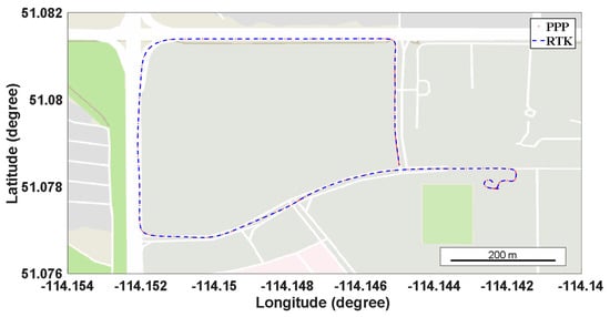 For the kinematic PPP, the field test is carried out around the children’s hospital in Calgary, Canada with a Trimble R10 receiver. The sample rate of the GNSS observation is 1 s. Meanwhile, the IGS station (UCAL) located 3 km away from the rover is used as the base station for real-time kinematic (RTK). The field test is operated from 20:23:00 to 23:00:00 (UTC time) on 18 April 2017. During the field test, the speed limit for the road section is 50 km/h, and several red lights are experienced at the intersections. The following Figure 9 shows the trajectory of the field test for kinematic PPP, in which the red dots represent the PPP solutions, while the blue dash lines denote the RTK results.