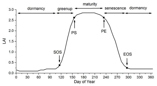 Remote-sensing vegetation phenological metrics are generally derived from satellite time-series data of vegetation parameters. Vegetation indexes (VIs) are one of the most commonly used parameters, including the normalized difference vegetation index (NDVI) [4,19,20,21] and enhanced vegetation index (EVI) [22,23,24]. Generally, the NDVI tends to lose sensitivity over dense canopies because of saturation [25], while the EVI has a larger dynamic range than the NDVI and is more resistant to atmospheric and soil background effects [26]. Many studies have explored other VIs to indicate the growing season transitions, such as the soil adjusted vegetation index (SAVI) [27], MERIS terrestrial chlorophyll index (MTCI) [28], perpendicular vegetation index (PVI) [9] and wide dynamic range vegetation index (WDRVI) [25]. While VI is an integrated indicator of the vegetation, the soil background, and the observation-illumination geometry, some vegetation physiological parameters have also been used to detect vegetation phenology, such as the leaf area index (LAI) [3], the fraction of photosynthetically active radiation (fPAR) [29] and albedo [30]. Compared with the VIs, these parameters provide more explicit information on the biophysical characteristics of vegetation changes. Among these parameters, the LAI is most widely used because of the availability of multiple remote-sensing products and its direct indication of physical and biological processes related to vegetation dynamics at global and regional scales, such as energy exchange and water and carbon cycling [31,32].